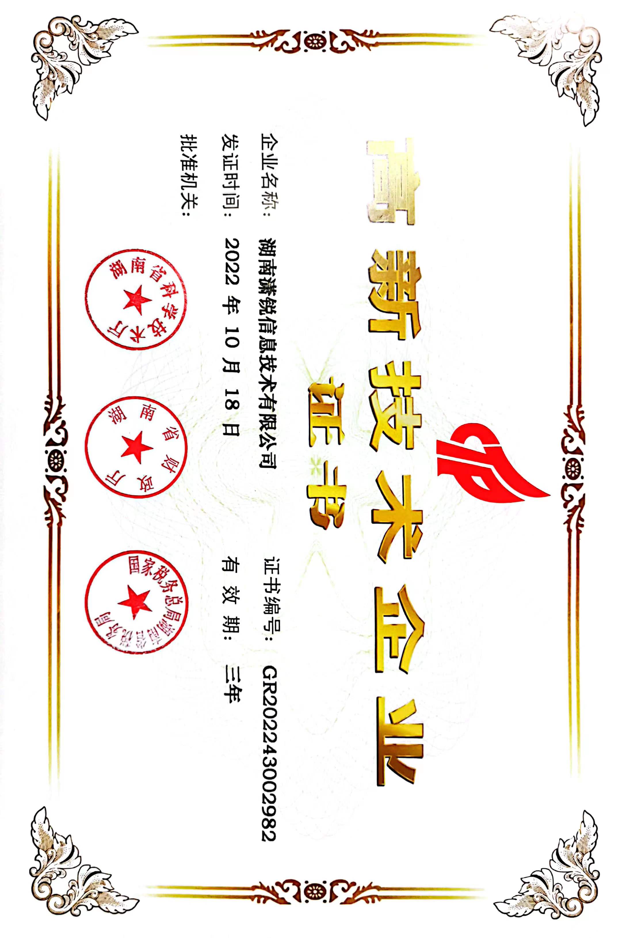 获得由湖南省科技厅、财政厅、税务局认证的国家高新技术企业证书...
